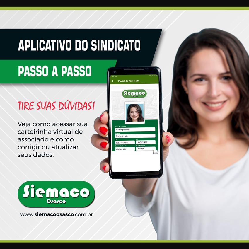 Novo aplicativo para celular lançado pelo Siemaco Osasco, ainda em fase de adaptações, já garante ao associado a exibição da sua carteirinha digital, que é um documento necessário para acesso à colônia de férias, clubes e clínicas conveniadas, bem como, já traz de forma rápida e fácil um guia para comunicação digital diretamente com o sindicato.