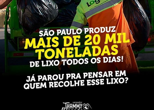 Com uma breve frase em destaque, o vereador chamou a atenção de todos quanto ao número expressivo de lixo produzido na maior capital do país. São cerca de 20 mil toneladas coletados todos os dias!