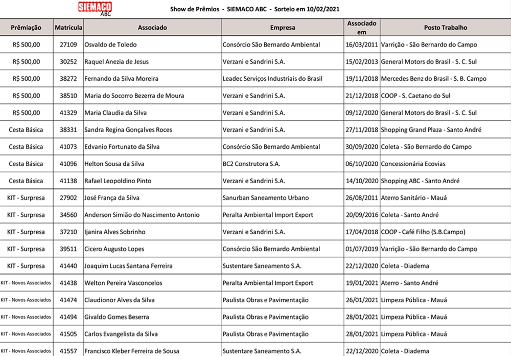 O sindicato informa que dessa lista, apenas 01 cesta básica não será entregue em razão do trabalhador sorteado não possuir em nossa base sistêmica, cadastro regular. Desta forma, a premiação será colocada à disposição para o sorteio da próxima rodada.
