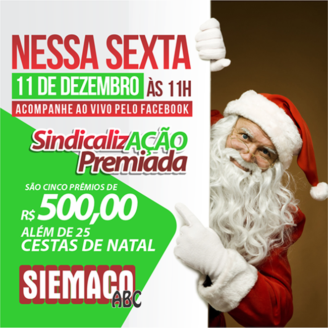 A última rodada do projeto ‘Sindicalização Premiada’ do Siemaco ABC, o sindicato sorteou 5 cheques no valor de R$ 500,00, 25 cestas de natal e mais 25 kits surpresa.
